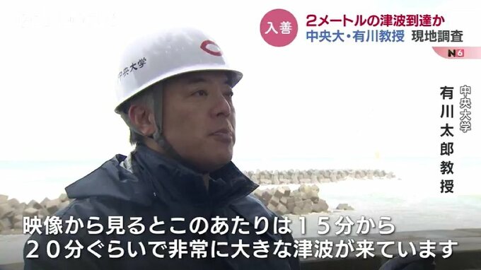中央大学 有川太郎教授:「映像から見るとこの辺りは(地震後)15分から20分ぐらいで非常に大きな津波が来ています。それ以外にももしかしたら(地震後)10分ぐらいで津波は来ていたかもしれませんので、そういうところをきちんと調査をして津波がどうやって発生したかメカニズムの解明に役立てたいと思います」