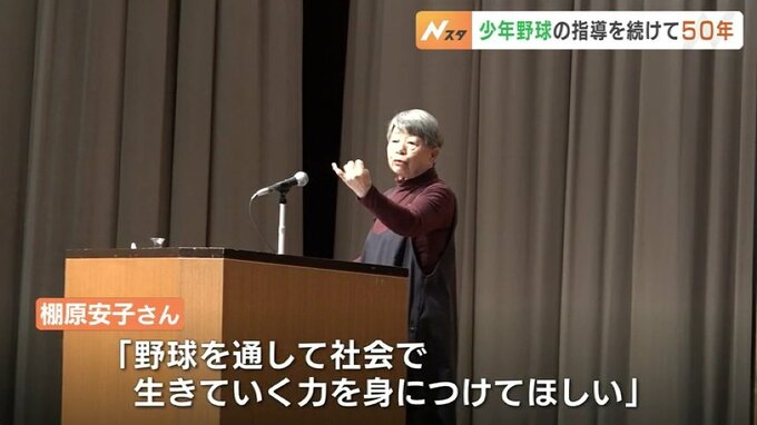 講演会には、チームの監督や保護者などおよそ300人が参加し、大阪で少年野球の指導を続けて50年、5人の子どもを育てながら、これまで1200人の指導に携わってきた棚原安子さんが講師に招かれました。