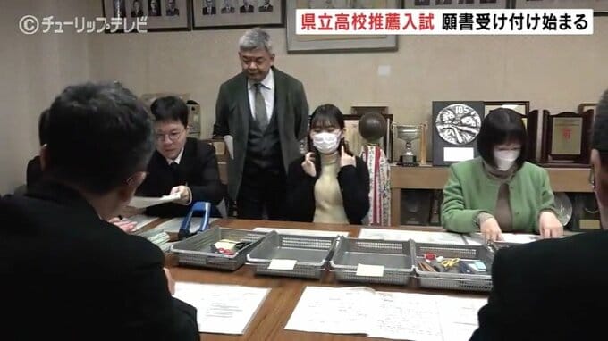 このうち富山北部高校では、午前9時の受け付け開始から中学校の教員が次々に訪れ、高校の担当者が記入漏れがないか、必要書類はそろっているか入念に確認していました。