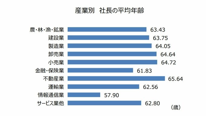 ニュースクリップ 社長の平均年齢は63.76歳で過去最高 最高齢は高知県65.96歳 最年少は広島県62.67歳 富山県は65.40歳で3位 年代別の企業業績は? 東京商工リサーチ調査 2024年2月2日(金) 16:07 国内 暮らし・マネー 最も若い「情報通信業」社長は60歳下回る… 産業別の平均年齢では、最高齢が不動産業の65.64歳、小売業が64.72歳、卸売業が64.64歳の順です。平均年齢の最も低いのは、ベンチャー企業の多い情報通信業の57.90歳で、唯一60歳を下回りました。