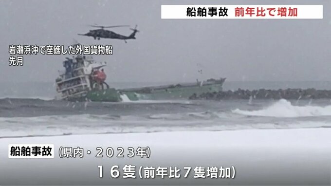 伏木海上保安部によりますと、2023年の1年間に富山県内で発生した船舶事故の隻数は16隻で、前の年に比べ7隻増えました。映像は先月に岩瀬浜沖で起きた座礁事故で、今回の統計には含まれていません。