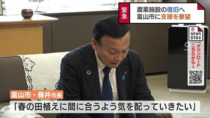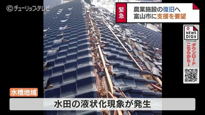 市内では地震によって婦中地域で農業倉庫の天井崩落や田んぼに水を供給する用水の導水管が破損したほか、水橋地域で田んぼの液状化現象が発生するなど米づくりに影響する甚大な被害が出ているということです。