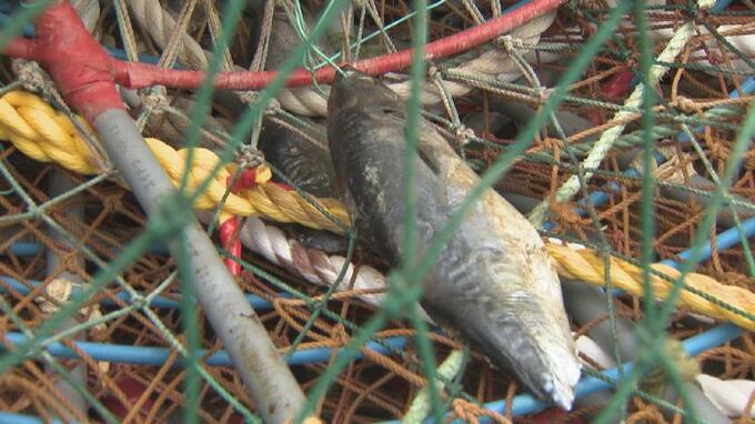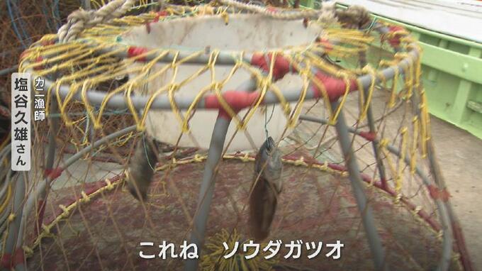 カニ漁師 塩谷久雄さん:「これね、ソウダガツオなんが、ソウダガツオを片身に半分におろして、片身を3つつけてある。全部のかごにこう3つつけてある」