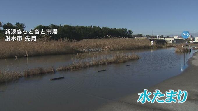 射水市の新湊きっときと市場では駐車場に大きな水たまりが…。