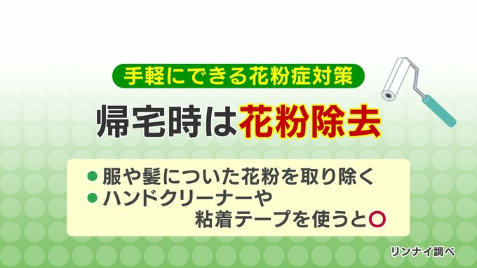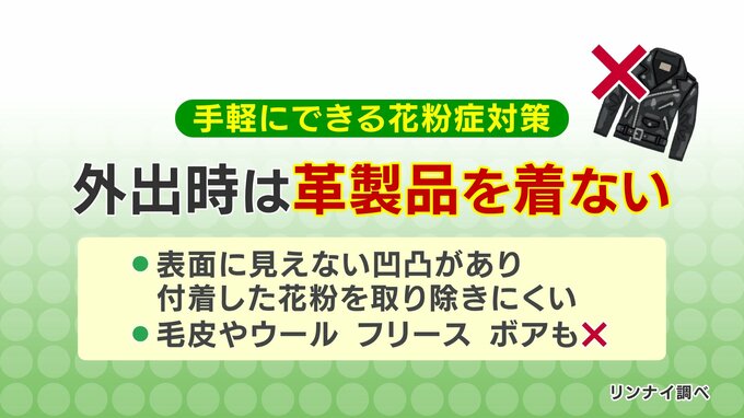 (1)外出時は革製品を着ない。革製品の表面には見えない凹凸があり、付着した花粉を取り除きにくい。毛皮やウール、フリース、ボアなども避けましょう。(2)帰宅時は花粉除去。家に入る前に服や髪についた花粉を取り除くのが大事。目や鼻に入らないようにハンドクリーナーや粘着テープを使うのが理想。