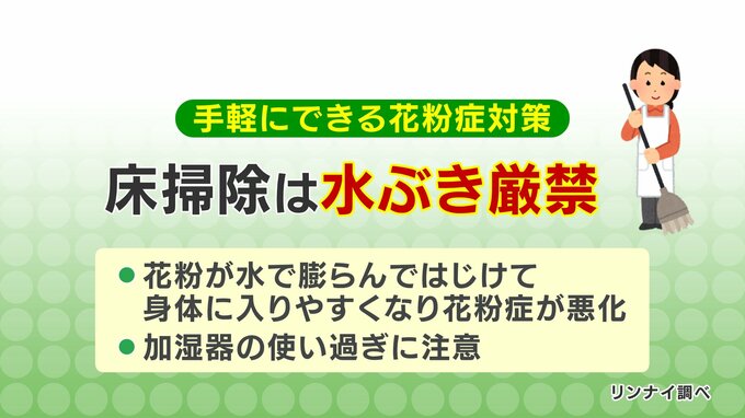 (3)床掃除で水ぶきは禁物。水ぶきをすると花粉が水で膨らんではじける。はじけた花粉は身体に入りやすくなり花粉症の症状を悪化させる。加湿器も使い過ぎに注意が必要。