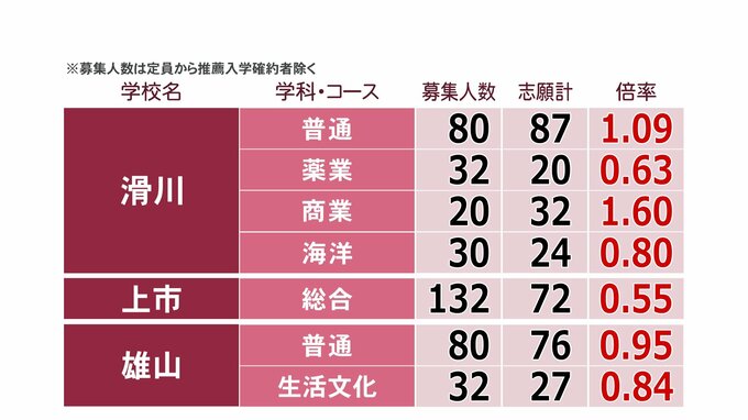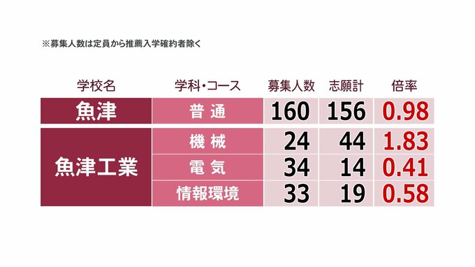 富山県公立高校入試 2024年志願倍率 富山中部・探究科学科 2.35倍 富山・探究科学科 1.74倍 高岡1.03倍【令和6年度高校受験 全校全学科掲載】 2024年2月27日(火) 17:00 国内 新川地域 高校別志願倍率 入善普通科は0.93倍、桜井普通科、土木科も定員割れです。 魚津の普通科は0.98倍で定員割れです。魚津工業・機械科は1.83倍と高くなっています。 滑川普通科は1.09倍。上市の総合学科と、雄山の普通科は定員割れです。