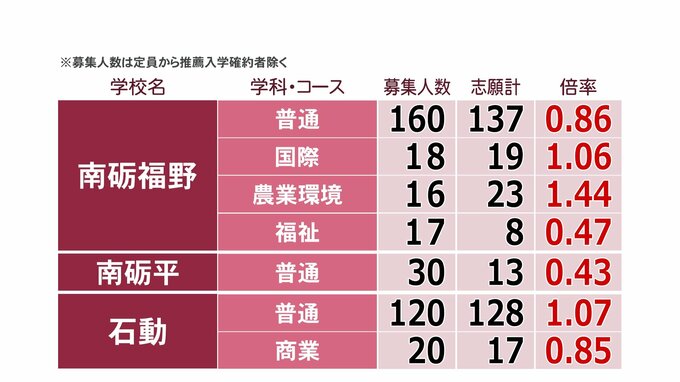 富山県公立高校入試 2024年志願倍率 富山中部・探究科学科 2.35倍 富山・探究科学科 1.74倍 高岡1.03倍【令和6年度高校受験 全校全学科掲載】 2024年2月27日(火) 17:00 国内 砺波市など 高校別志願倍率 砺波・普通科は1.05倍、砺波工業は電子科が1.64倍、そのほかの学科は定員割れとなっています。 南砺福野・普通科は0.86倍、南砺平・普通科は0.43倍。石動・普通科は1.07倍などとなっています。