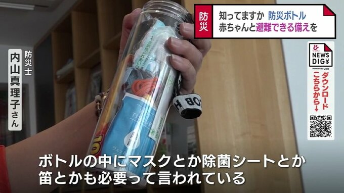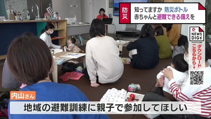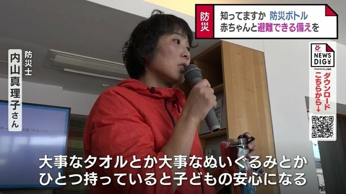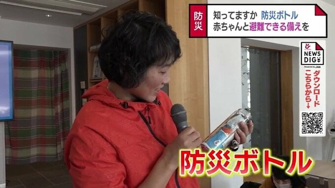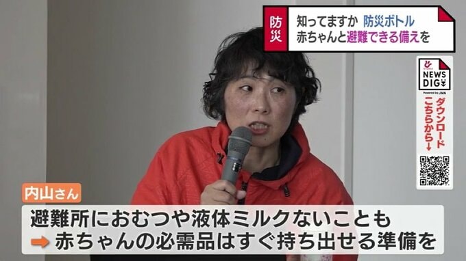 内山さんは、避難所にはおむつや液体ミルクが備わっていないことが多いので、赤ちゃんに必要なものはすぐに持ち出せるよう準備しておいてほしいとアドバイスしていました。勧めたのは、防災ボトルの準備です。