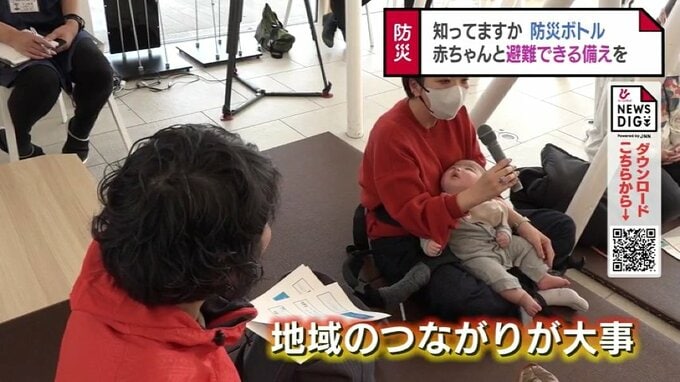 内山さんは、災害時には地域のつながりが大事になるので、子どもが大きくなったら地域の避難訓練に親子で積極的に参加してほしいと話し、日ごろのつながりや備えの大切さを伝えていました。