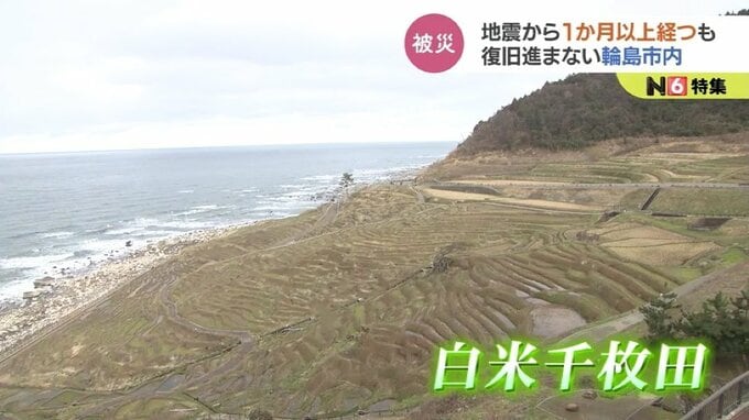 道路は応急的な修復工事が進み、車1台が通れるようになっていました。さらに進んでいくと奥能登を代表する観光名所、白米千枚田に到着しました。