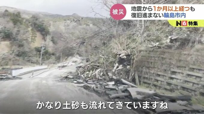 嘉藤アナ:「かなり揺れますね。道の脇、本来道路だった場所はがれきが積みあがった状態で、かなり土砂も流れてきていますね」