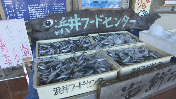 船に積めるだけ積んでも、まだ3倍のイワシが定置網に残るほどだといいます。漁師が陸にイワシを上げ、氷見市内の鮮魚店、浜井フードセンターに並びました。