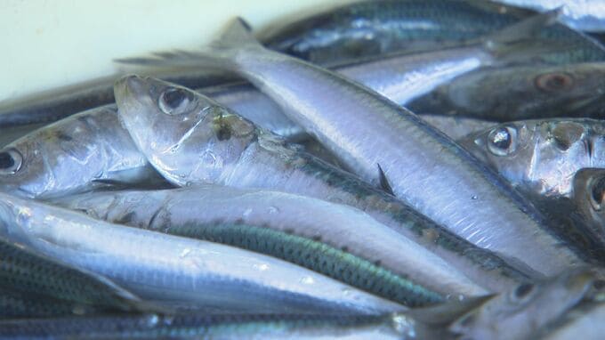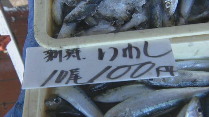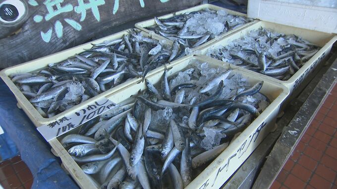 浜井フードセンター 浜井大祐さん:「先週くらいから突然獲れ始めまして大きさ的には中葉イワシと言って、そんなに大きくないんですけど、しばらくは続きそうな感じですね。うちは10匹で100円でお出ししています。普段は、大きさにもよりますけども倍以上はすると思います。大葉イワシと言って1回り2回り大きいやつですと、1匹で50円とか100円とかするときもあります」