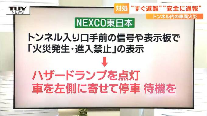また、NEXCO東日本では、トンネル入り口手前の信号や表示板で「火災発生・進入禁止」の表示が出た場合、ハザードランプを点灯し、車を左側に寄せて停車し、待機してほしいと呼びかけています。