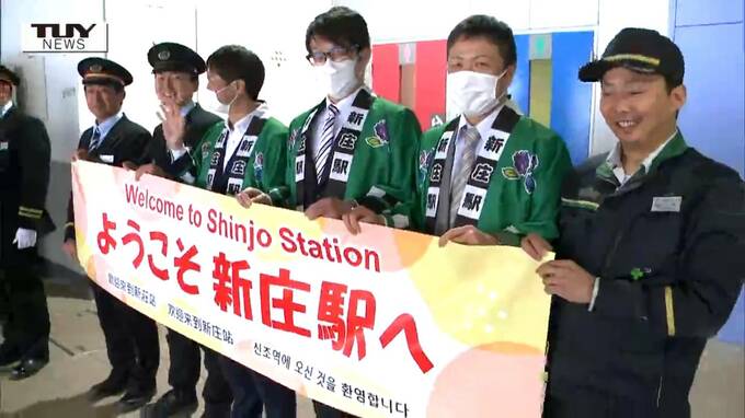 午後4時半ごろにJR新庄駅に到着した山形新幹線新型車両E8系。