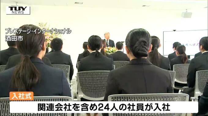 酒田市で行われた入社式では、関連会社を含め24人の新入社員が新たなスタートを切りました。中にはバレーボールでの活躍が期待される社員の姿も。