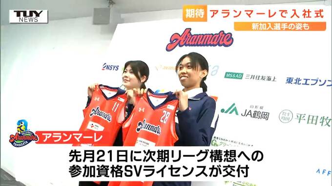 きょうから新年度、各地で入社式が行われました。酒田市のプレステージ・インターナショナルでは真新しいスーツに身を包んだ新入社員が社会人の第一歩を踏み出しました。期待の新加入選手の姿もありました。