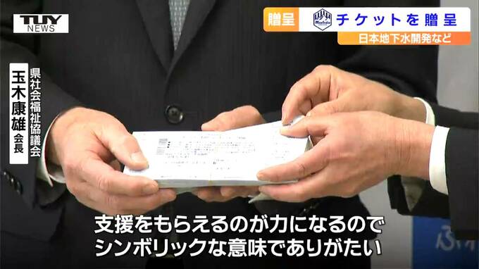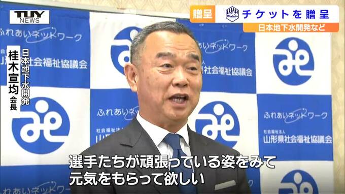 障がい者施設などを利用する子どもたちにスポーツの楽しさを感じてもらおうと、山形市の企業らが県社会福祉協議会にモンテディオ山形のホームゲームのチケットを贈りました。