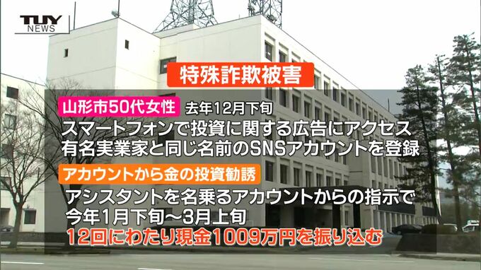 山形市の50代女性が、SNSで知り合った実在の有名実業家を名乗るアカウントから金の投資を勧められ、現金およそ1000万円をだまし取られる詐欺被害がありました。