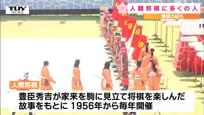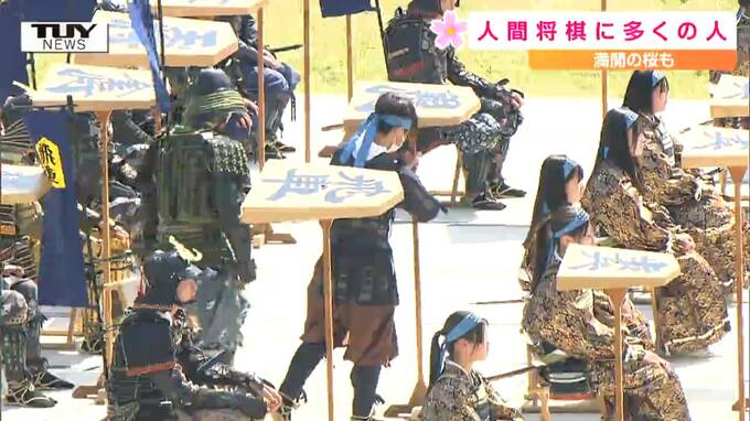 将棋の町・山形県天童市の春の一大イベント「人間将棋」がおととい行われ、満開のサクラの中、大勢の観客で賑わいました。