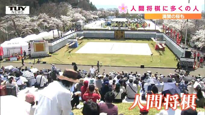 およそ2000本のサクラが満開を迎えた天童市・舞鶴山で行われた「人間将棋」。豊臣秀吉が家来を駒に見立てて将棋を楽しんだ故事をもとに昭和31年から毎年行われています。