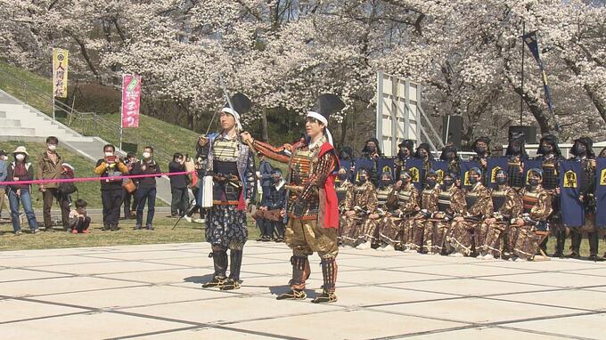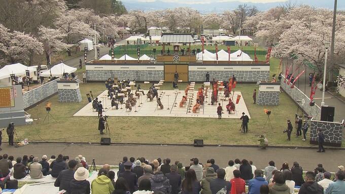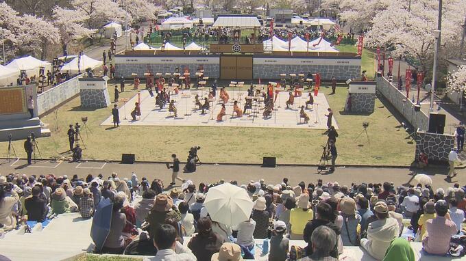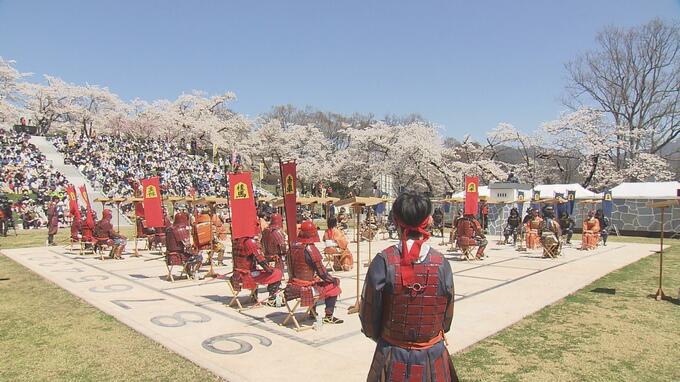 2000本のサクラが咲く中で行われる春の風物詩とあって、全国から将棋ファンが訪れる。今年は4万2000人の観客でにぎわった。