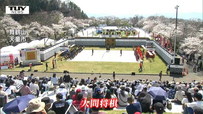天童市の舞鶴山で行われる人間将棋は、豊臣秀吉が家来を駒に見立てて将棋を楽しんだという故事をもとに、昭和31年から毎年行われている。