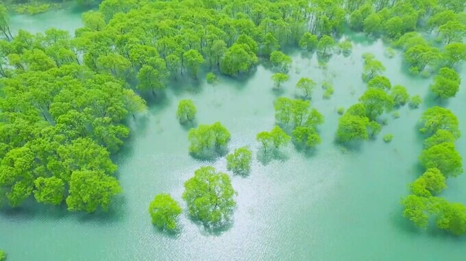 新緑のシロヤナギの木が湖面から突き出ている幻想的な風景が現れる。