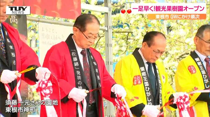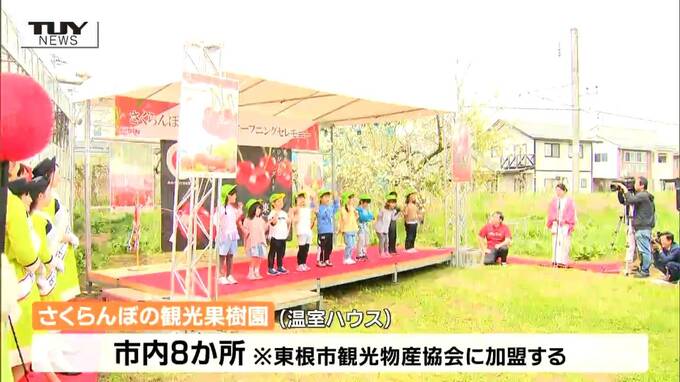このうち、東根市神町にある須藤一元さんの果樹園では、地元の園児たちが元気な歌を披露し、オープンを祝いました。