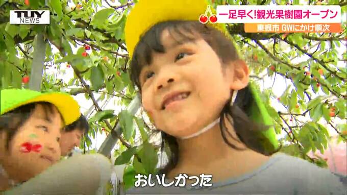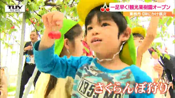東根市では18日、一足早く、さくらんぼの観光果樹園がオープンしました。地元の子どもたちが、さっそく真っ赤なさくらんぼを頬張りました。