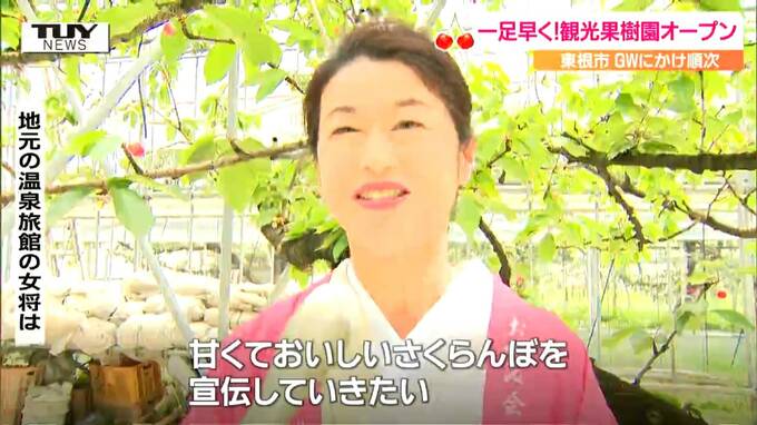 地元の温泉旅館の女将は「さくらんぼ狩りを目的に、全国からたくさんのお客さんが来られて東根がにぎわう。甘くておいしいさくらんぼを宣伝していきたい」