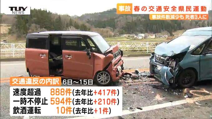 また、この期間の交通違反での摘発件数は、去年に比べ931件増え2176件でした。内訳は、速度超過が888件と前の年からほぼ倍増しています。次いで、一時不停止が594件。飲酒運転も10件ありました。