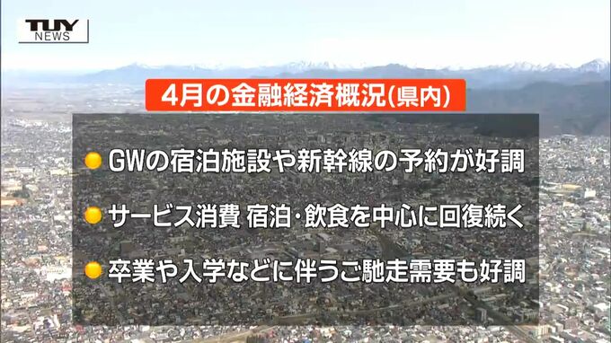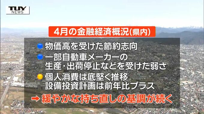日本銀行山形事務所によりますと、県内の4月の金融経済概況は、物価高を受けた節約志向、一部自動車メーカーの生産・出荷停止などを受けた弱さはみられるものの、個人消費は底堅く推移し、設備投資計画は前年比プラスとなるなど、緩やかな持ち直しの基調が続いているということです。