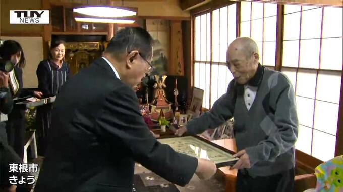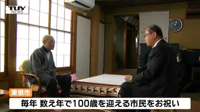 山形県東根市で23日、数え年で100歳になるお年寄りに市長が長寿のお祝いを贈りました。