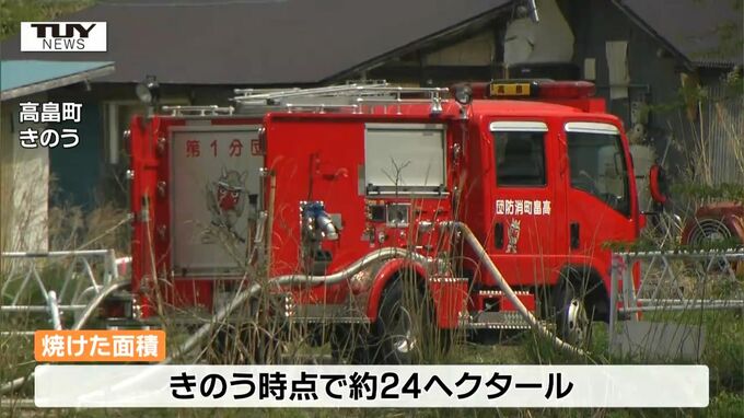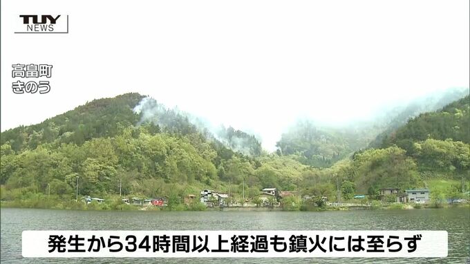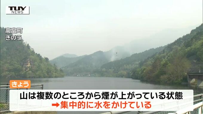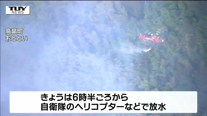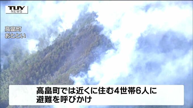この火災は、おとといの午後1時半ごろ、高畠町安久津の山で起きたもので、町では、近くに住む4世帯6人に避難を呼びかけるなどして、消火活動にあたっています。