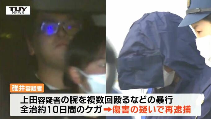 この事件に絡み、警察はきょう、上田容疑者の腕を複数回殴るなどの暴行を加え全治およそ10日間の皮下出血等のケガをさせたとして、碓井容疑者を傷害の疑いで再逮捕しました。