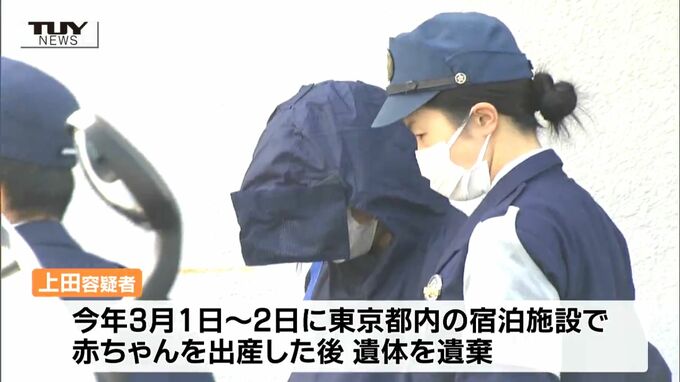 上田容疑者は、今年3月1日から2日の間に東京都内の宿泊施設で赤ちゃんを出産し、その後に遺体を遺棄していて、警察が発見した遺体は、白骨化した骨の一部だったということです。