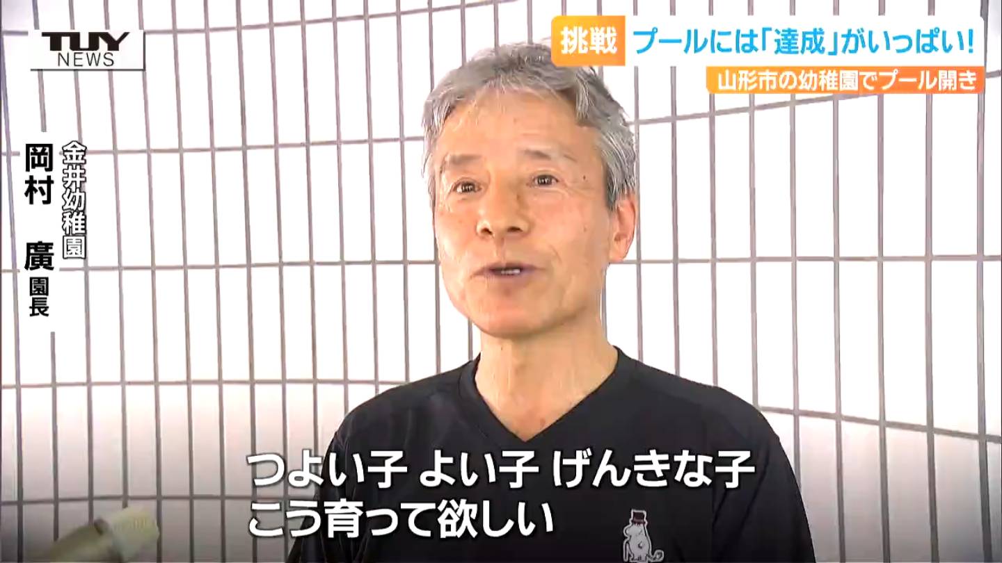 金井幼稚園 岡村廣 園長「去年は顔をつけることが難しかった子どもも、きょうは挑戦をして、みんなと一緒にやっている子どもが多いことから、挑戦する心がついているなと思った。つよい子 よい子 げんきな子、これに育って欲しい」