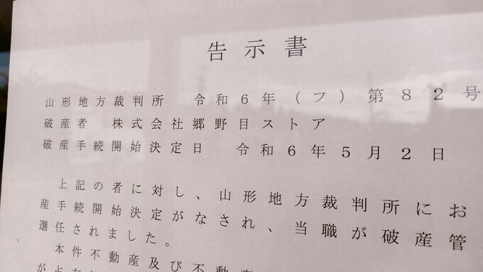 新庄店にも、同じように破産手続きに関する告示書が。