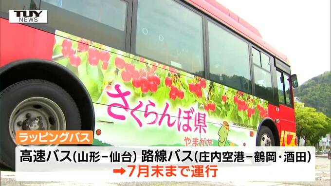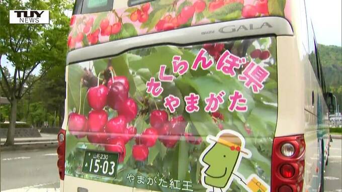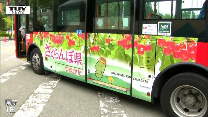 県内の観光地の魅力をPRしていこうと、サクランボがデザインされたバスが運行されることになり、1日にお披露目されました。