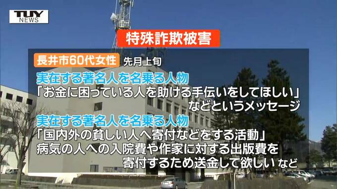 警察によりますと先月上旬、長井市の60代女性がSNSを利用していたところ、実在する著名人を名乗る者から、お金に困っている人を助ける手伝いをしてほしいなどというメッセージが届きました。