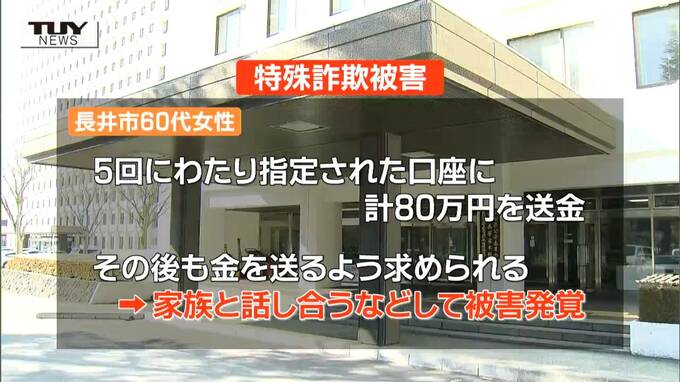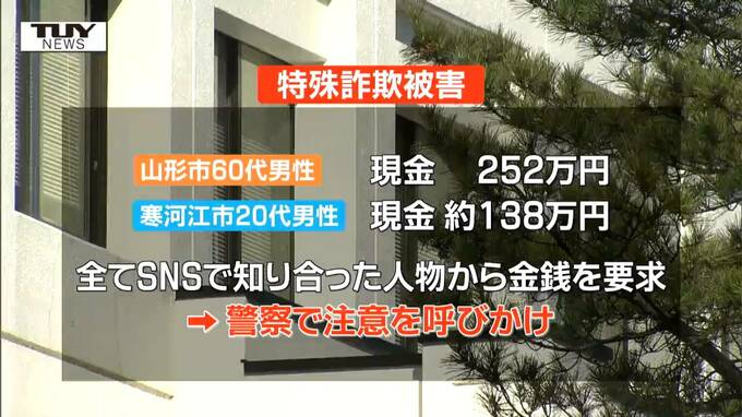 また、山形市では60代男性が現金252万円をだまし取られる被害が、寒河江市では20代男性が現金およそ138万円をだまし取られる被害が確認されています。