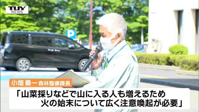 村山総合支庁で行われた出発式では、小畑義一森林整備課長が空気の乾燥が続いている現状について話し、「山菜採りなどで山に入る人も増えてくるため、火の始末について広く注意喚起をしていくことが必要」などと職員に注意の必要性を共有しました。