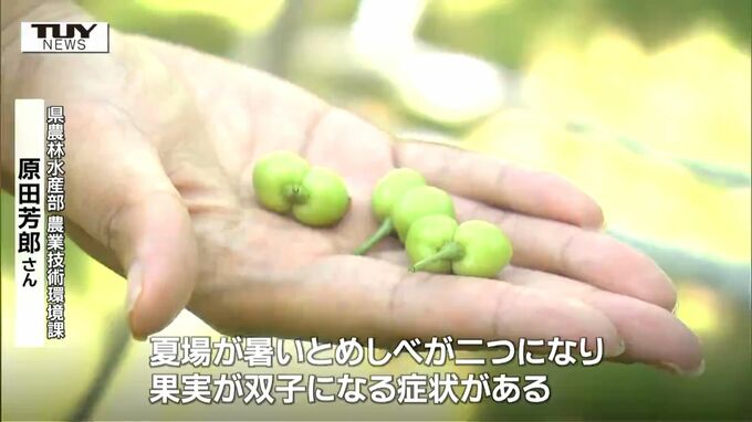 県農林水産部 農業技術環境課 原田芳郎さん「さくらんぼの花芽は前年の夏から作られ始めていて、夏場が熱かったりすると、めしべが二つになってしまい果実が双子になる症状がある」