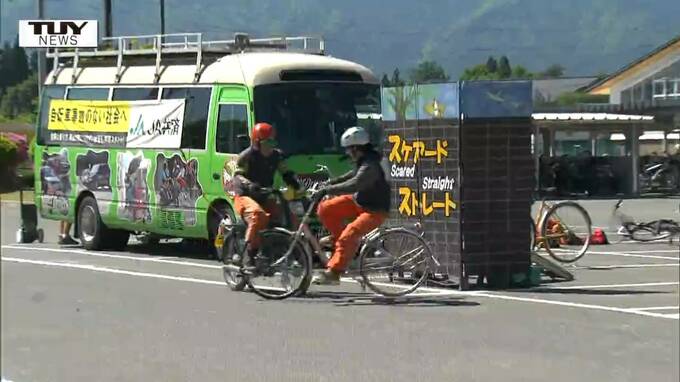 きょう、山形県白鷹町の中学校で、自転車を安全に乗ってもらうために、スタントマンによる交通安全教室が行われました。
