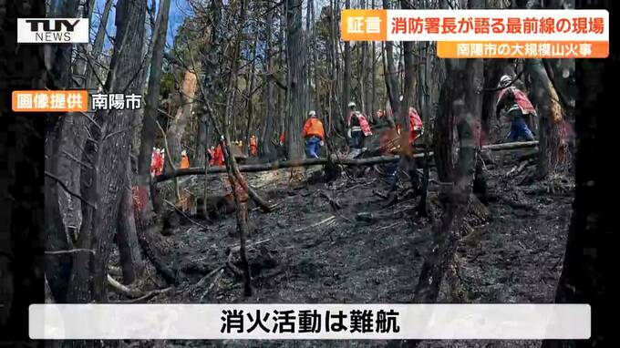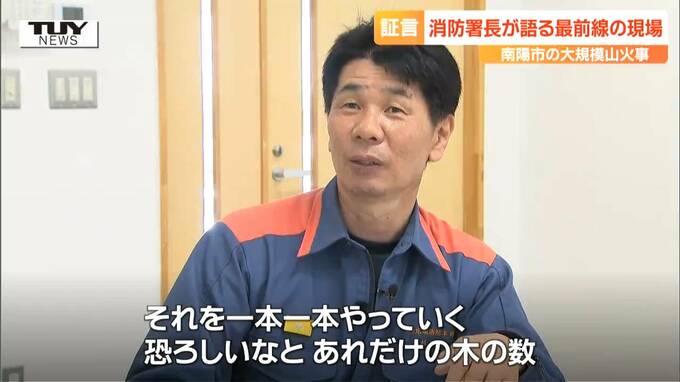 南陽消防署 杉原利彦 署長「自衛隊の5トンの水を何回も落としたんです。それでも消えない。結局は地上隊が行って、木をチェンソーで切って切って、中を沈没させた。最終的に人の力でしかなかった。それを一本一本やっていく。恐ろしいなと。あれだけの木の数ですし」