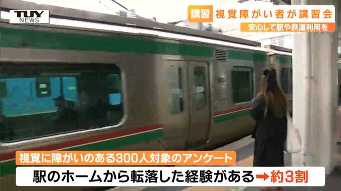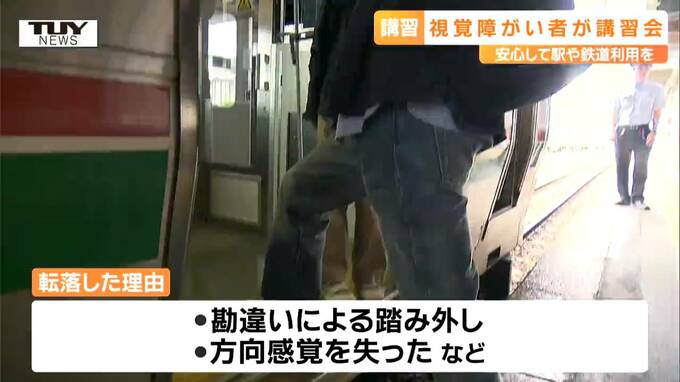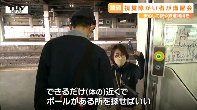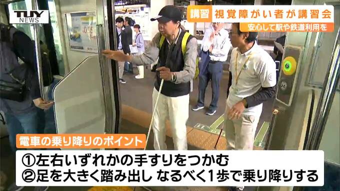 目に障がいのある人が、安心して駅や鉄道を利用するための講習会が開かれ、実際の車両を使い、電車に乗り込む際の注意点などを確認しました。