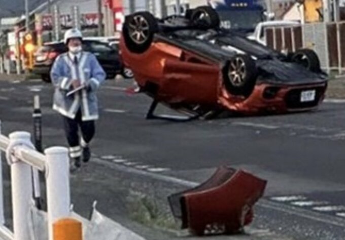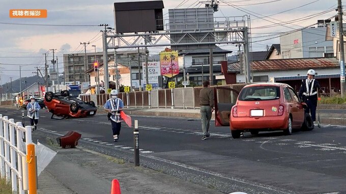 消防や警察によりますと駐車場から道路に出てきた女性の車を避けきれず、男性の車が衝突して横転したとみられ、男性は消防に対し「スローモーションのように横転した」などと話しているということです。