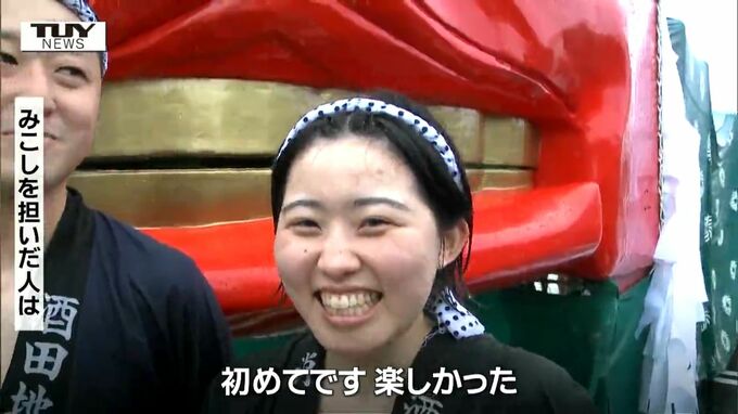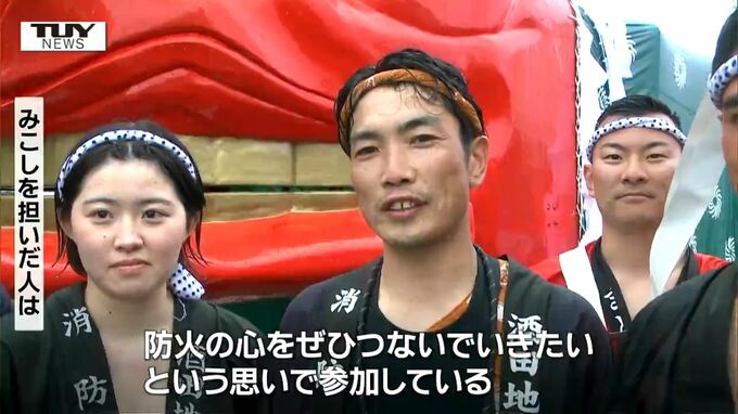 みこしを担いだ人「酒田大火を機に復興を目指して酒田祭りが開催されています。防火の心をぜひつないでいきたいという思いで参加している。」